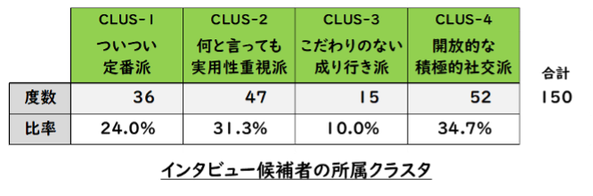 得られた回答から、インタビュー対象の候補者150名の「消費行動傾向モデル」における所属クラスタが判定(判別精度:71.5%)されます。