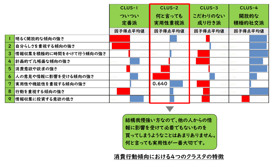 所属クラスタを判別したことによって、消費行動傾向におけるCLUS-2(何と言っても実用性重視派)の9つの心理特性の平均値(因子得点平均値)も得られますので、その心理特性を切り口にインタビューを重ねることで、より対象者の解像度を高めることもできるでしょう。