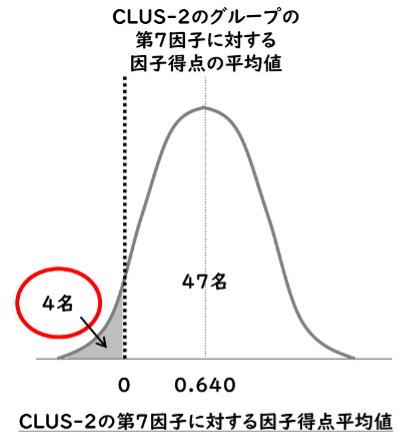 因子得点平均値は0.640となっていますので、CLUS-2の47人の第7因子に対する傾向性は、所属クラスタを判定した段階で、まずは全員0.640(他のクラスタよりは第7因子に対する傾向性はとても強い)と考えることができますが、あくまでも因子得点の平均値が0.640となっているというだけです。
